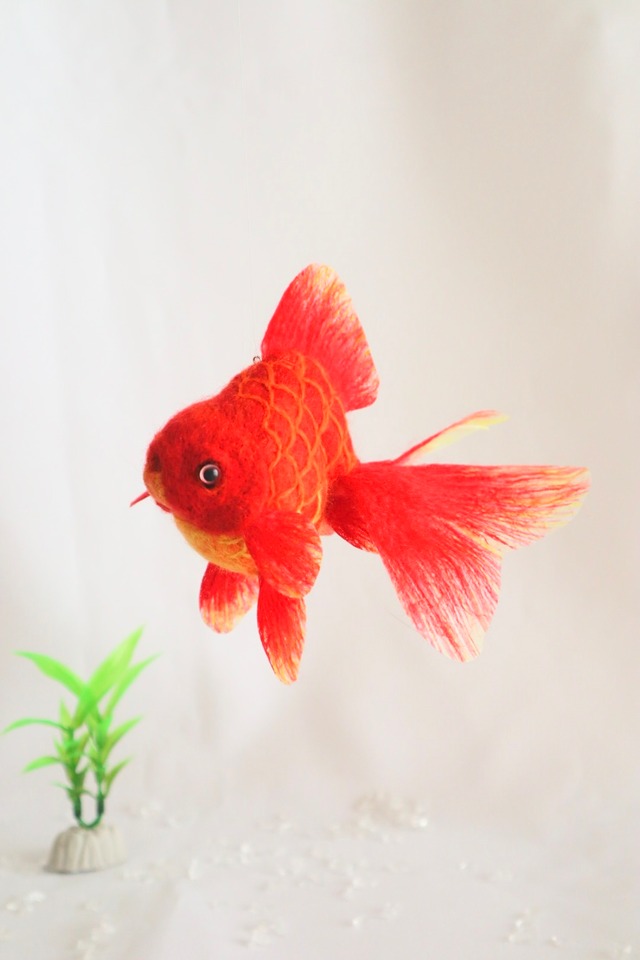 This is a beautiful goldfish mobile. 赤い金魚らしい更紗琉金です。 黄色の鱗が赤に映えて可愛らしいです。 場所を取らないので置いて飾っても良いですし、 背中についた金具にテグスを付けて空中をたゆたう展示もおすすめです。 size 高さ7cm×横9cm This is a goldfish mobile. You can hang this from the ceiling. Hang this wherever you like. He is a beautiful Red and white ryukin. I hope you like him. It's a goldfish made of wool felt. A wonderful gift for a girl, a woman, a fish collector, a fisherman. I will put it in the plastic case or box and send it. All works are handmade. I make works by hand one by one and I mix several colors and make a color of wool felt. They are been very carefully made. So there is no same thing. Please choose it, like time to choose the genuine goldfish!
