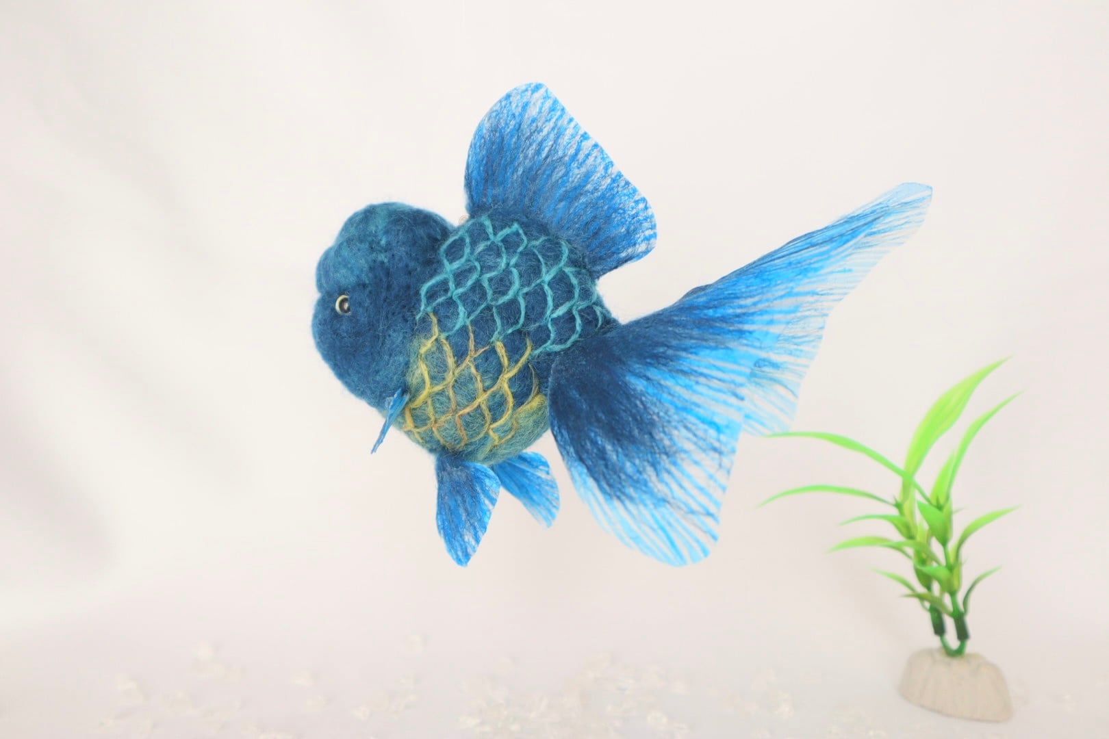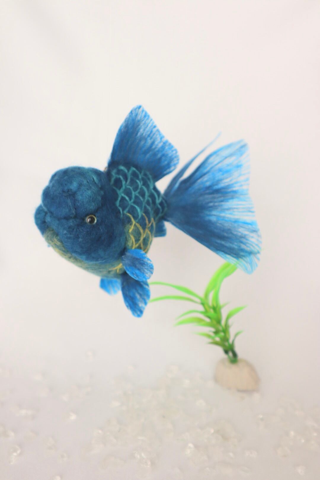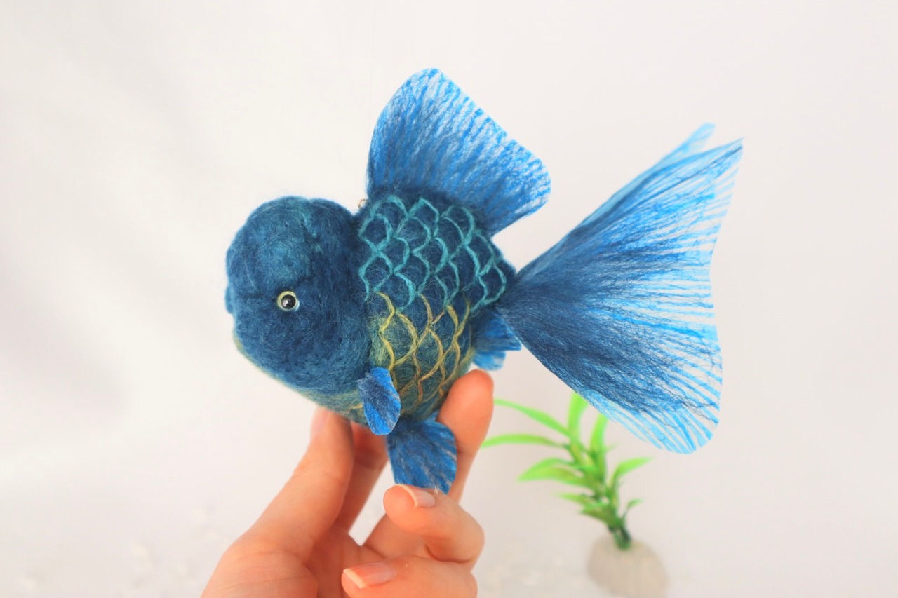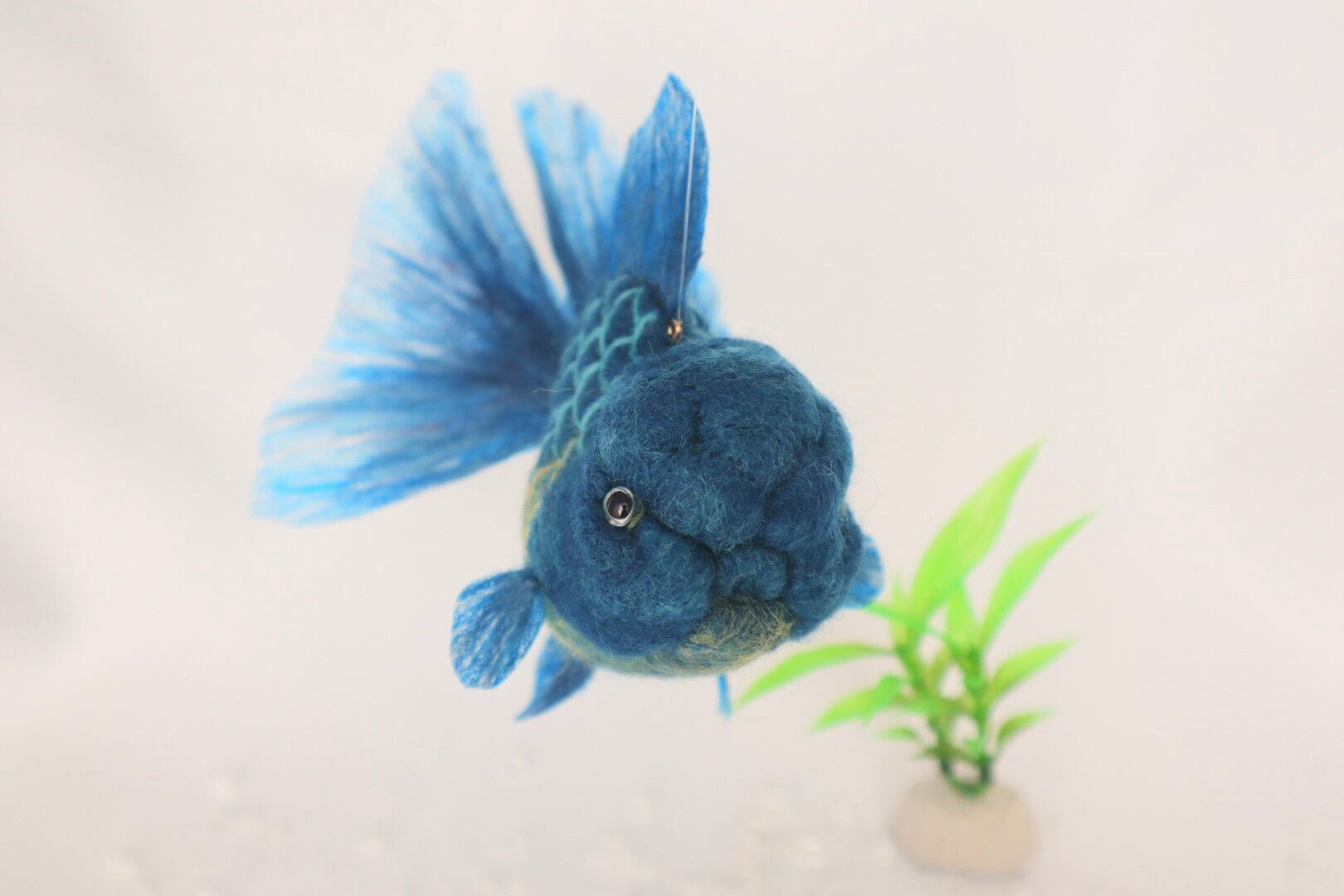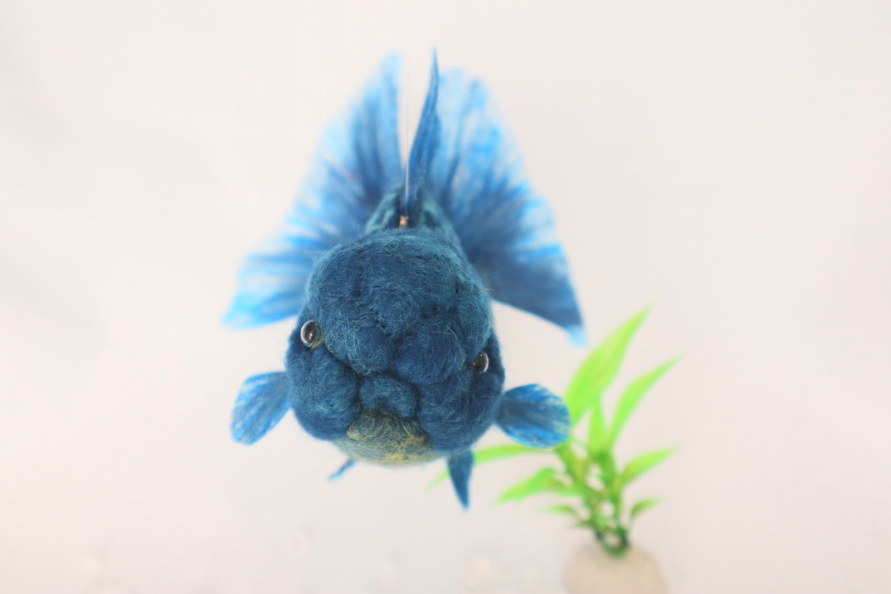 This is a refreshing Blue Oranda goldfish. It features a stunning gradient of yellow scales toward the belly. I have used a brighter, more vivid blue than a real Blue Oranda, creating a very fresh and vibrant impression. This piece is highly recommended for everyone, whether you are a goldfish lover or not!