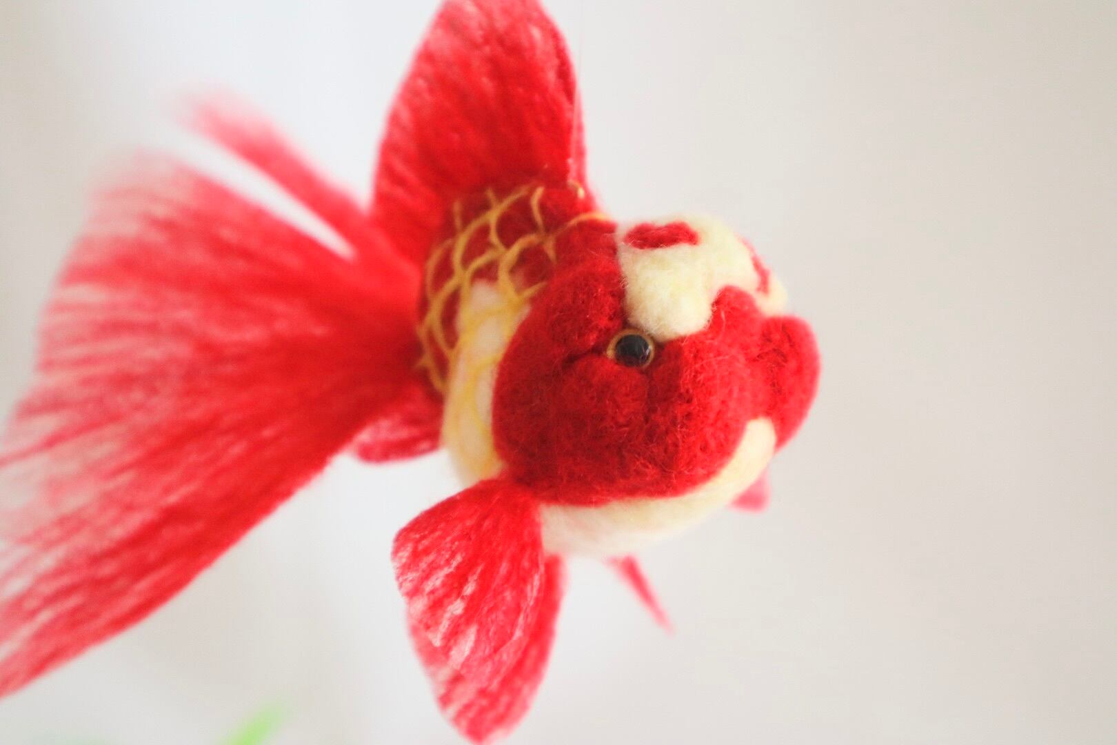 金魚の特徴的なフォルムと温厚な性質が羊毛フェルトで表現され、どこか温かみのある可愛らしさを演出します。