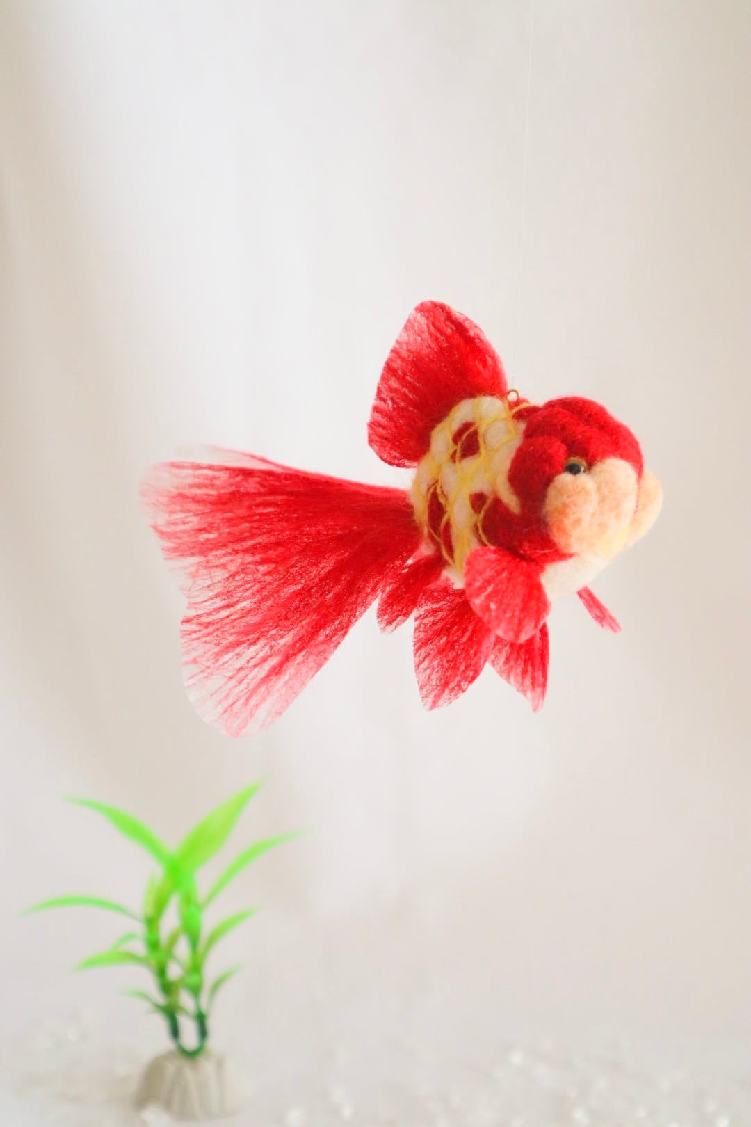 金魚の特徴的なフォルムと温厚な性質が羊毛フェルトで表現され、どこか温かみのある可愛らしさを演出します。