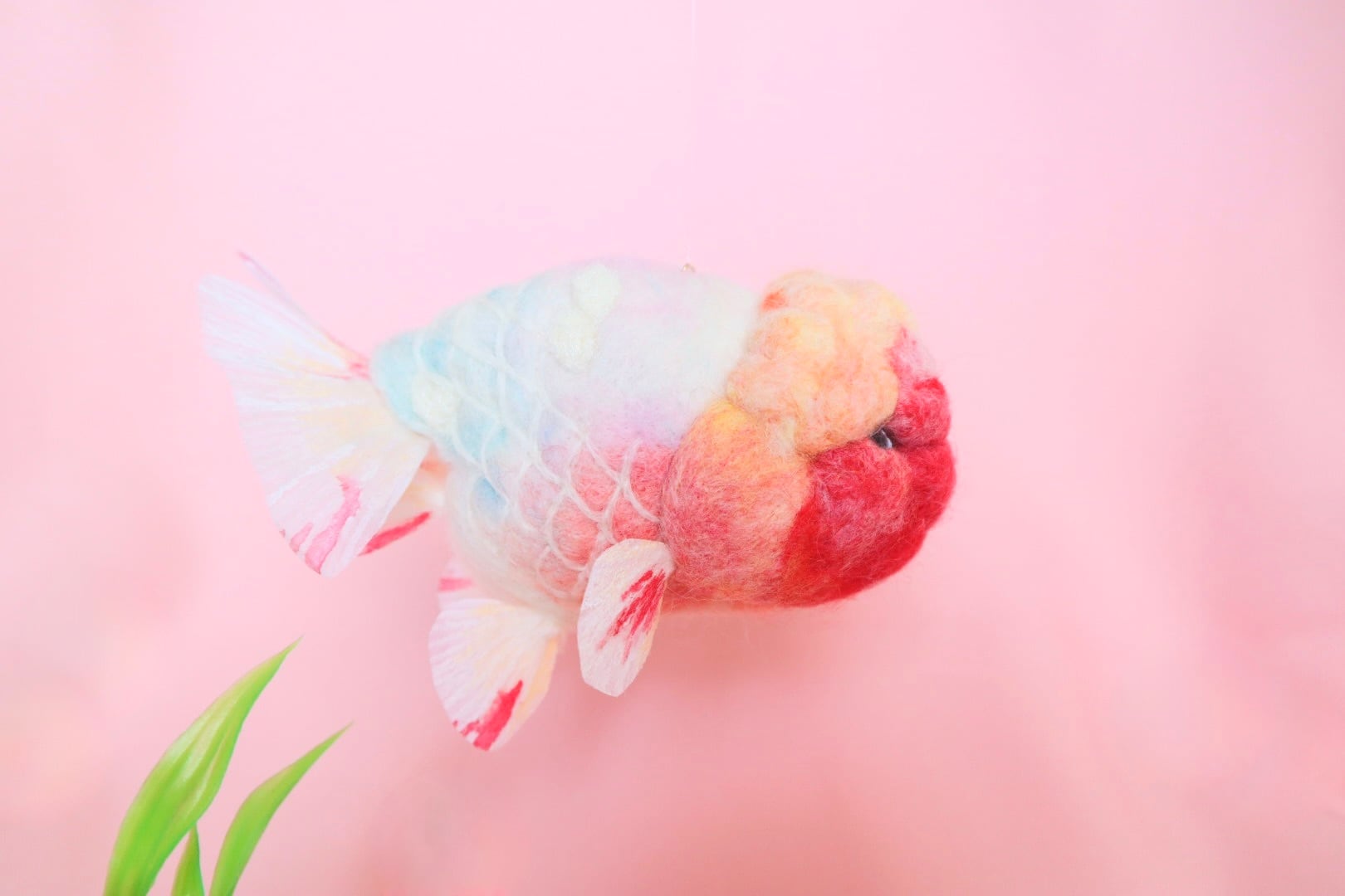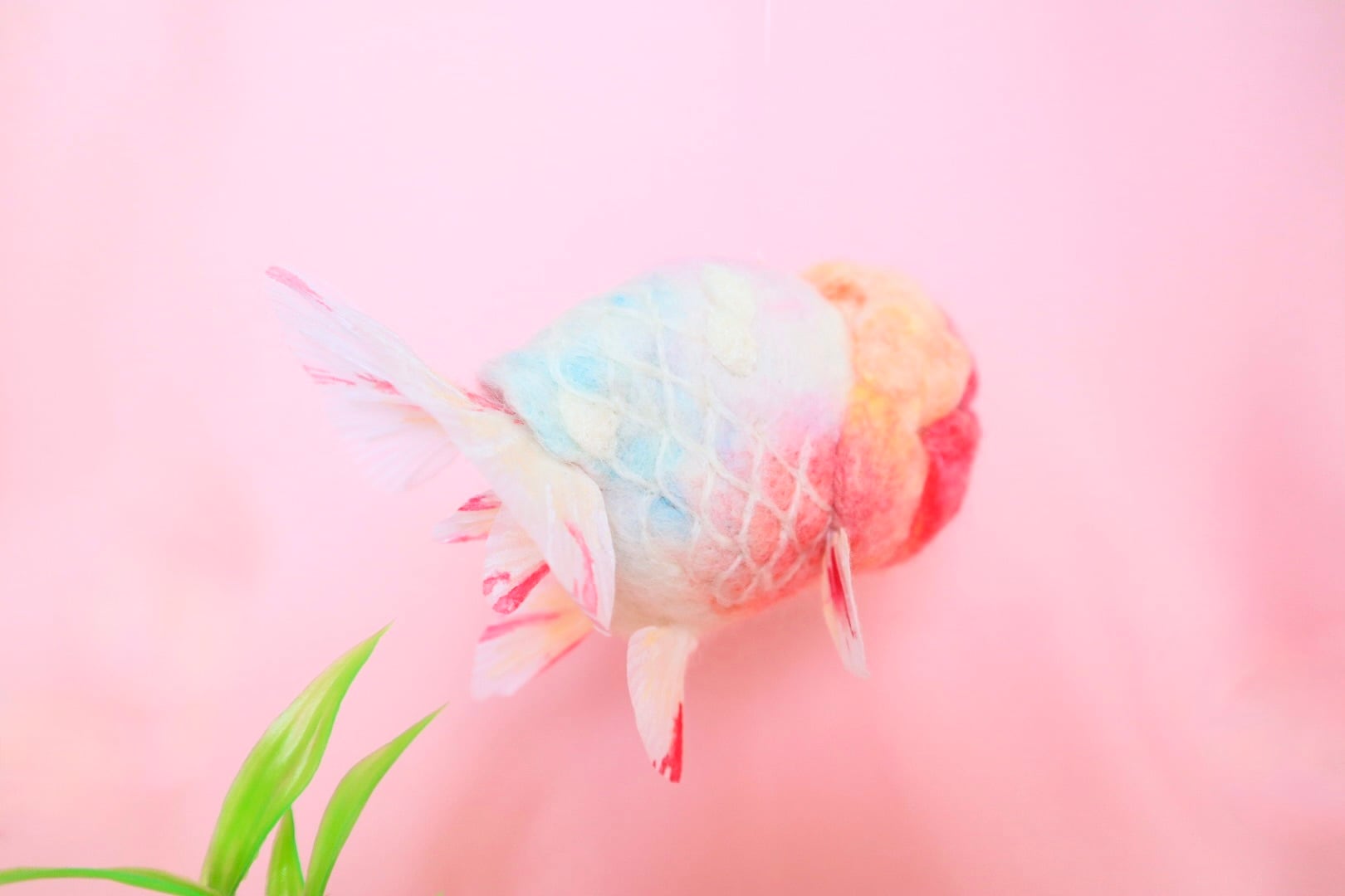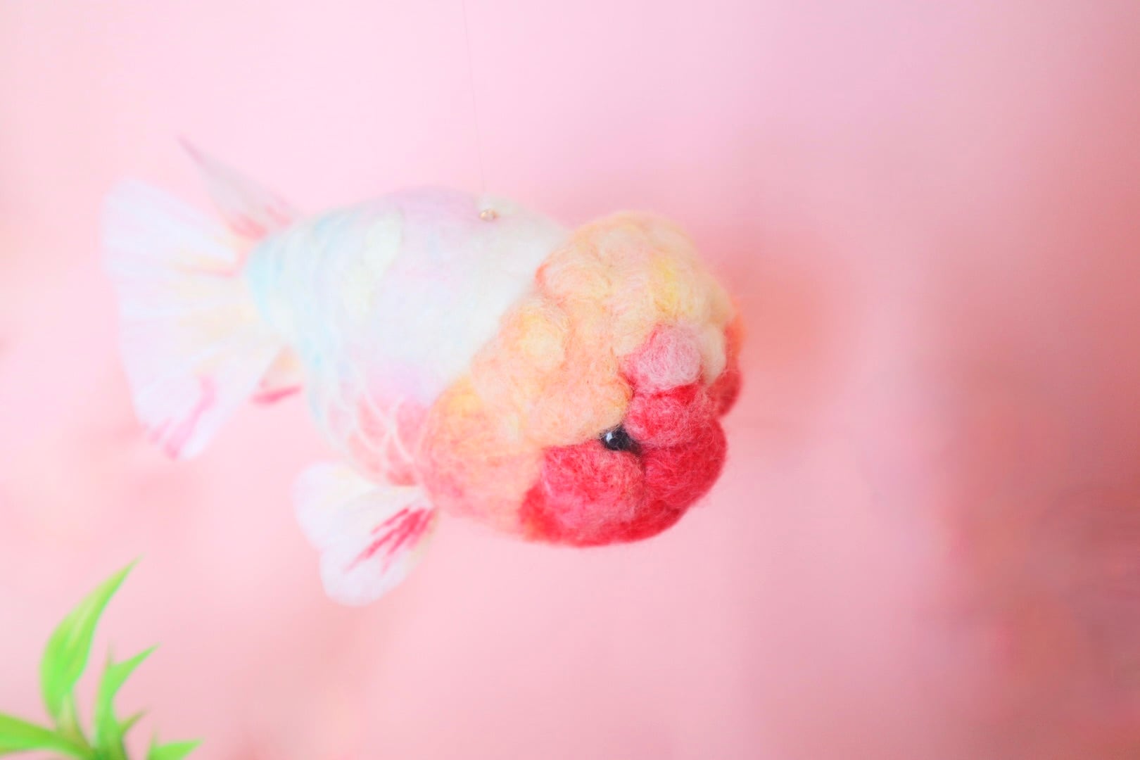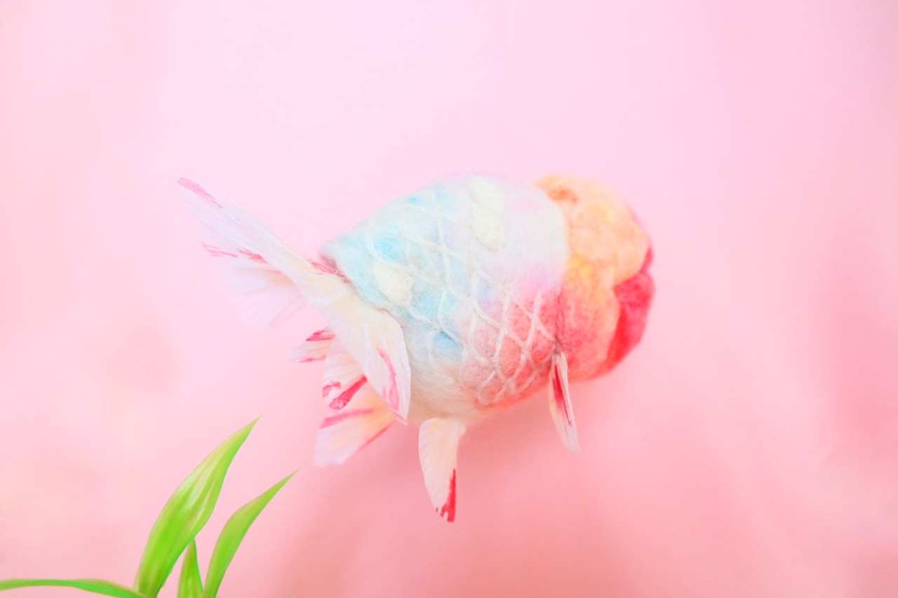 金魚の特徴的なフォルムと温厚な性質が羊毛フェルトで表現され、どこか温かみのある可愛らしさを演出します。