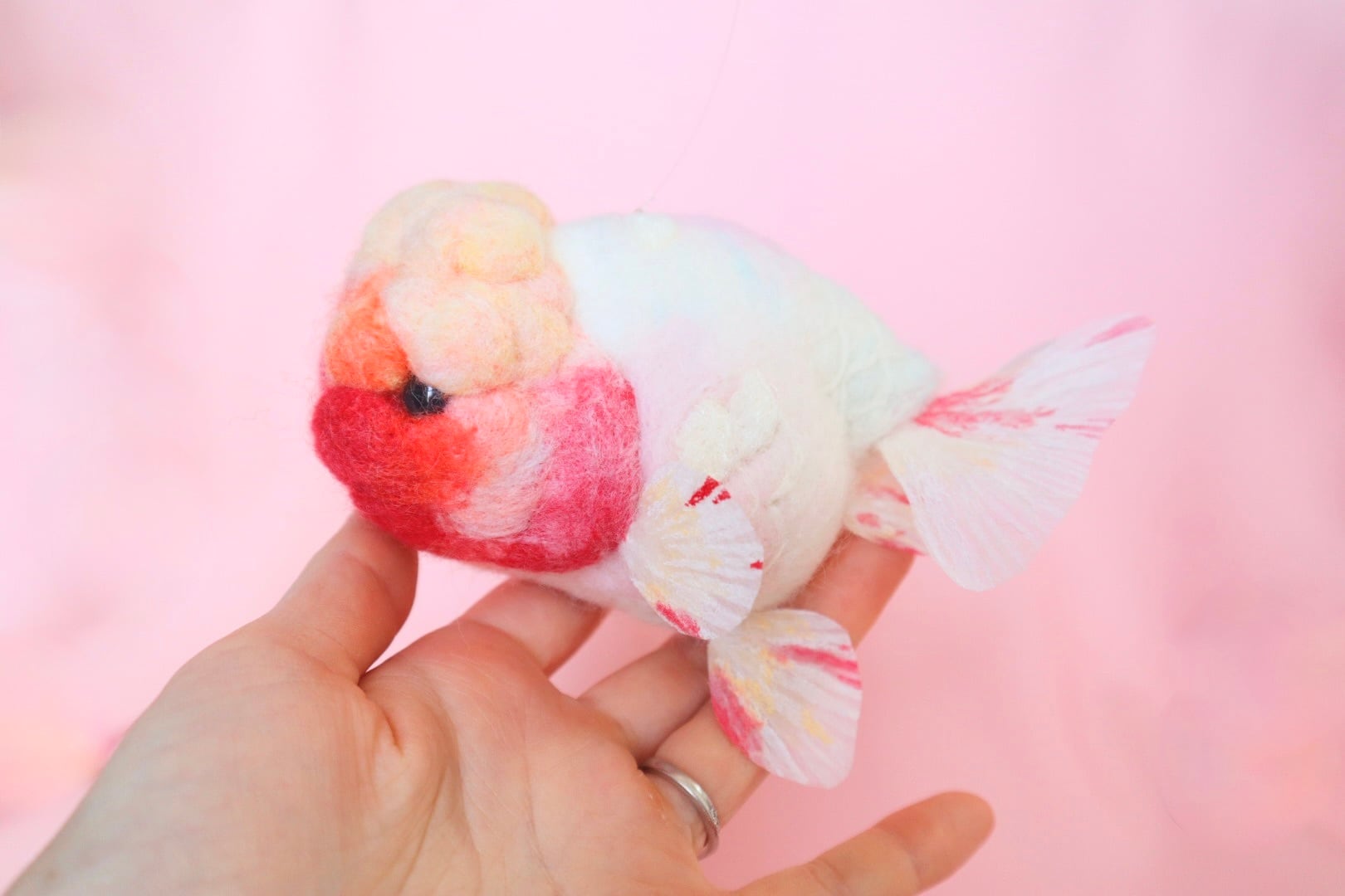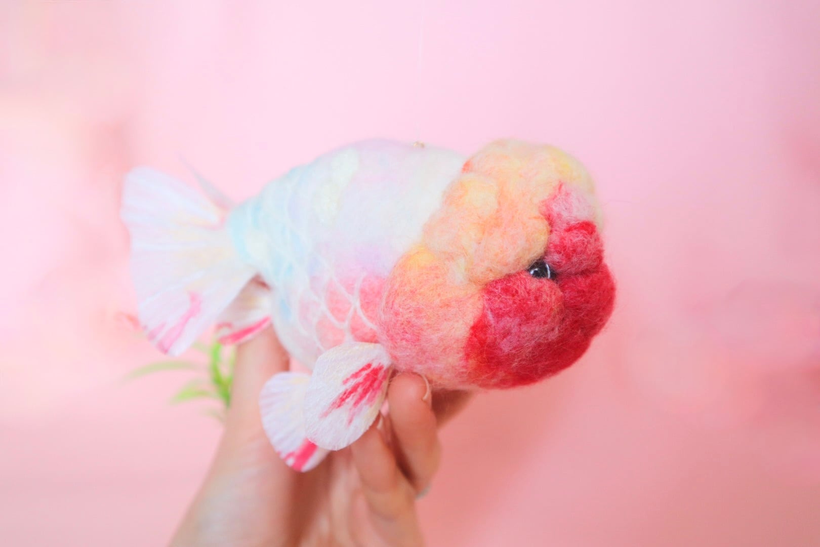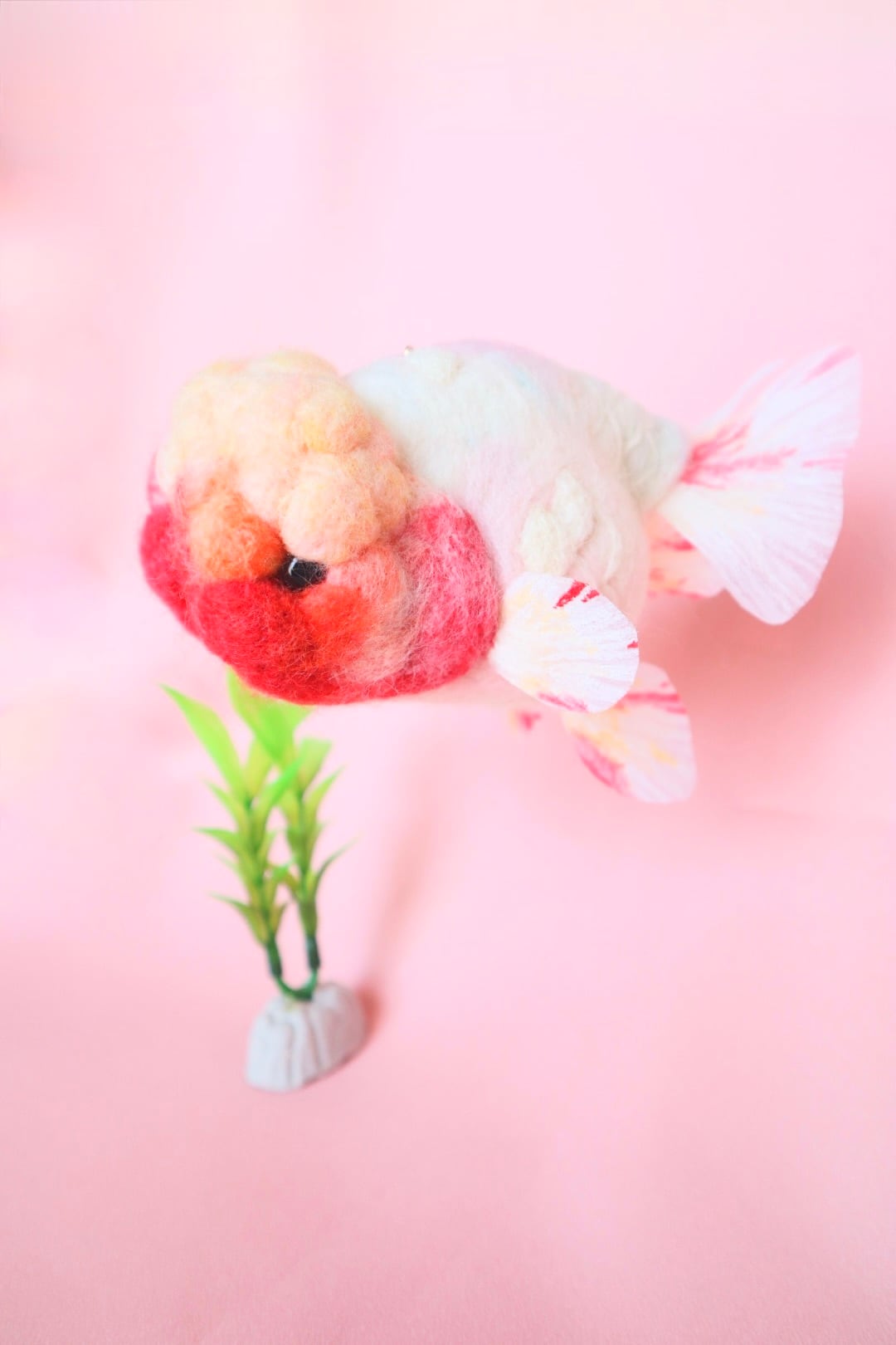 金魚の特徴的なフォルムと温厚な性質が羊毛フェルトで表現され、どこか温かみのある可愛らしさを演出します。