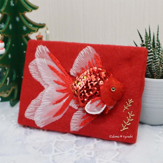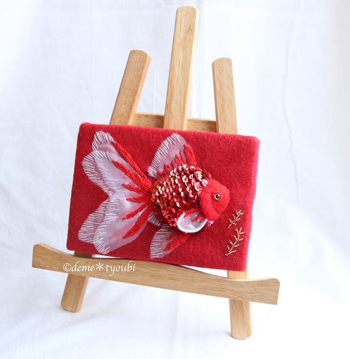 壁で飼える琉金の壁掛け作品です。 スパンコールを刺繍した鱗が可愛いです。 好きな場所で金魚が飼える作品です。 サイズは縦12cm×横15cmです。